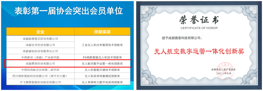 經(jīng)大會選舉,成都攜恩科技有限公司當(dāng)選協(xié)會新一屆副會長單位,董事長劉洋當(dāng)選協(xié)會新任副會長。此外,協(xié)會對攜恩科技做出的突出貢獻(xiàn)進(jìn)行了表彰,并授予攜恩科技“無人航空數(shù)字運(yùn)管一體化創(chuàng)新獎”榮譽(yù)。